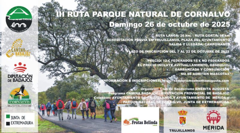El Ayuntamiento de Mérida pone en marcha la “III Ruta Parque Natural de Cornalvo”, perteneciente al circuito ” CIRCUITO CAMINA BADAJOZ”, organizada por el Club de Senderismo Emérita Augusta, y en colaboración con el Ayuntamiento de Trujillanos